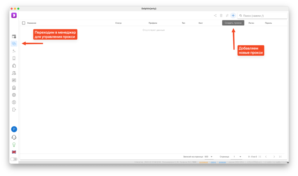 Настроить прокси сервер в Dolphin{anty} достаточно просто. Для этого Вам необходимо перейти в менеджер управления прокси, иконка которого размещена в левой боковой панели, и затем кликнуть "Создать прокси".