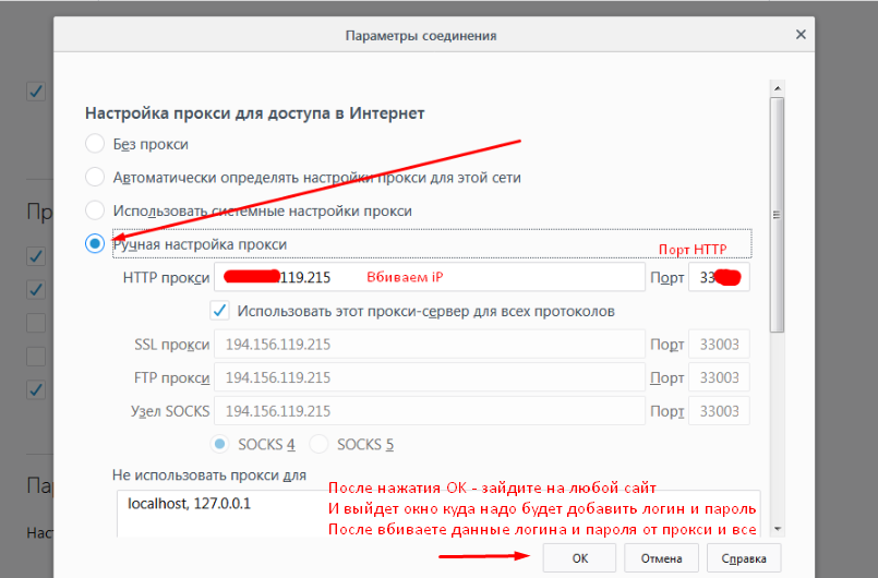 • enter the HTTP proxy address of the purchased proxy server and the port - if you purchased an HTTP proxy server;